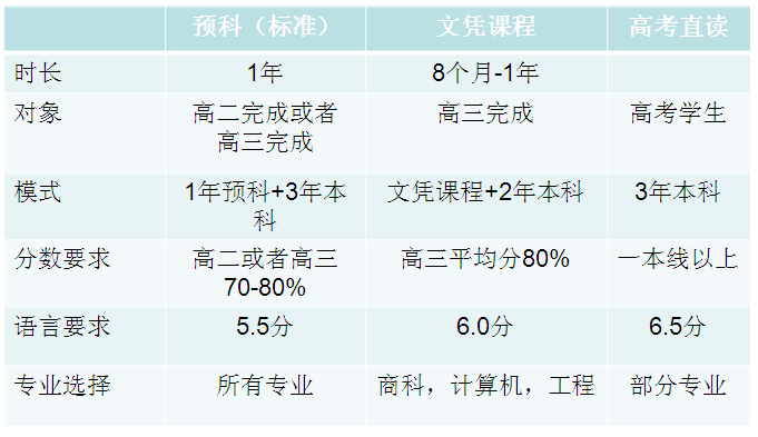 学校的预科学院,课程的设置实质是把预科和大一结合在了一起,课程结束后,学生通过转学分的方式把这个课程里所修的科目转到所衔接的大学中,学生可以直接读大二,这个要求学生入读前高中毕业,雅思5.5-6.0分。录取条件要高于预科,低于本科。