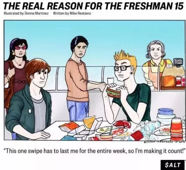 众所周知美国是多民族文化大熔炉,这一特性也代表了美国极强的包容性。在这里生活学习没有太多规矩,美国人也大多热情幽默,沟通起来没有障碍。所以在美国经常有街上的陌生人冲着你微笑,各个国家学生打成一片的场景,这也得以让身在异国的我们能够不那么拘谨地,热闹地参与到美国的日常学习和生活中去。同样,这个特点也体现在吃这件事上,美国大学里盛传的“freshman 15 ”真的不是空穴来风,而是一个个活生生的例子堆砌起来的。由于美国食物高蛋白,高热量的特点,想要保持住身材的小伙伴们就要多加注意了。