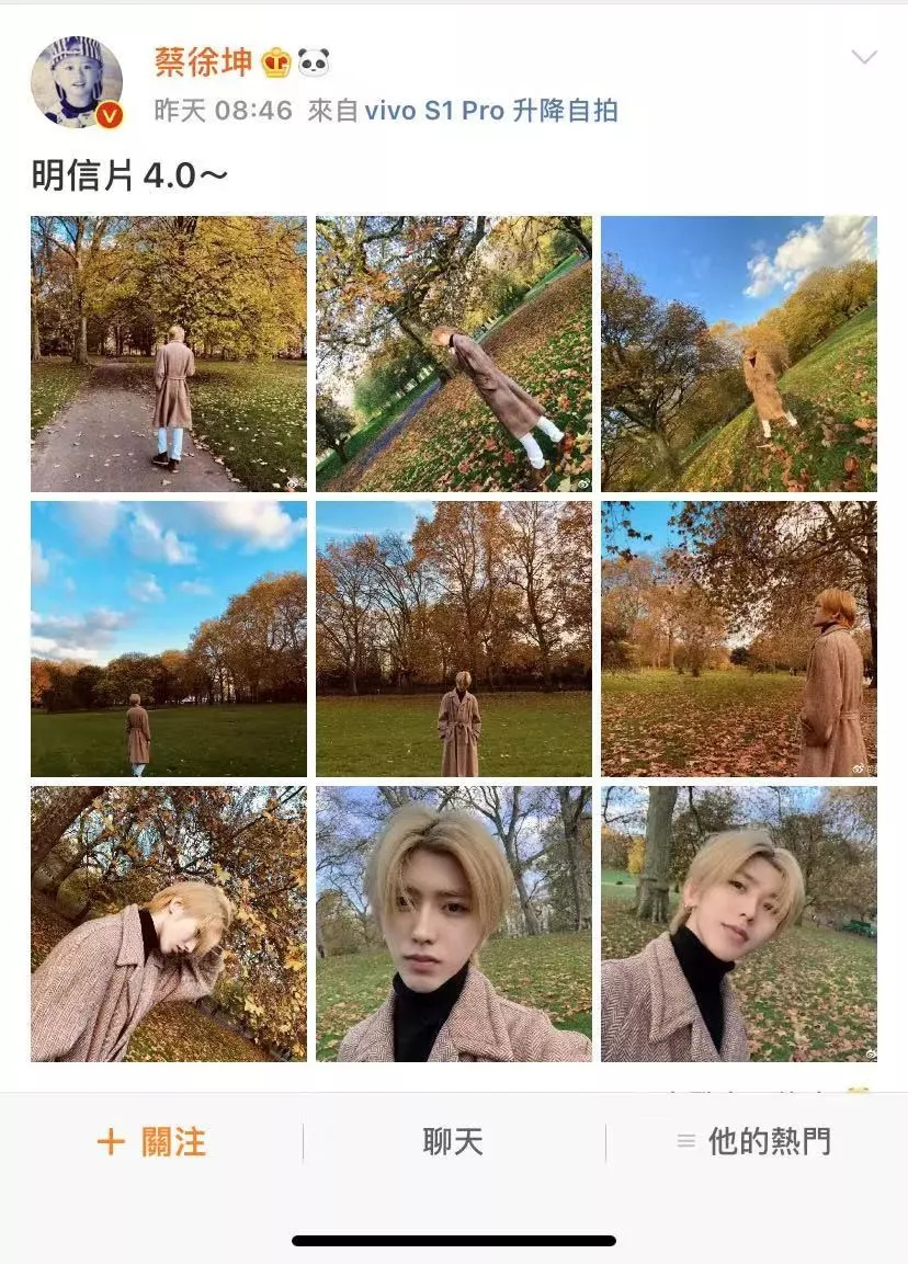 近日蔡更新了一组照片,并配文:“明信片4.0。”有网友爆料称这是蔡在利兹大学校园里拍的。