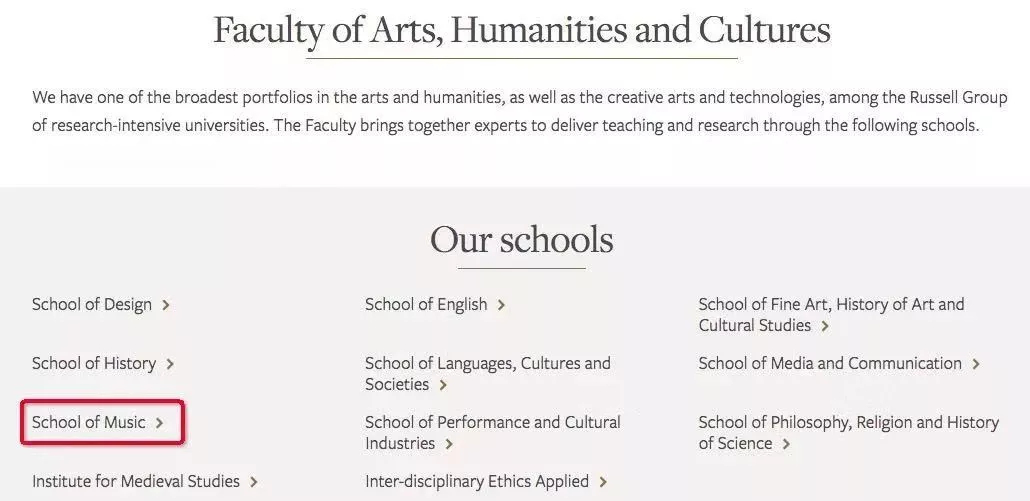 利兹大学音乐学院(School of Music)则是利兹大学艺术、人文和文化学院(Faculty of Arts, Humanities an Cultures)的院校之一。