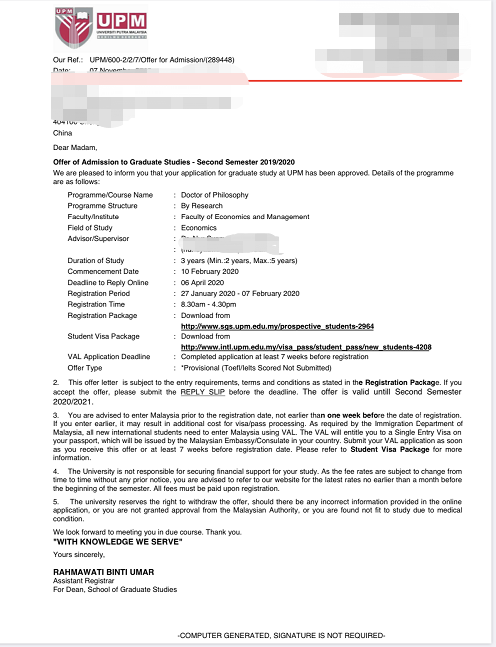 恭喜亲爱的cao宝宝,博特拉经济学博士顺利录取!!!