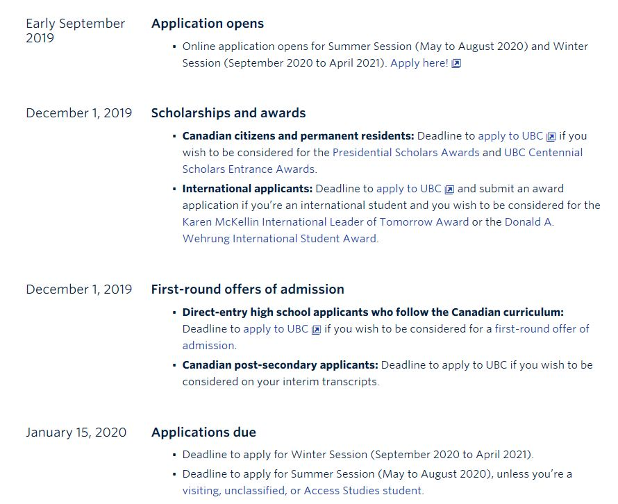 UBC大学在9月初就已经开始申请了,申请截止日为2020年1月15日,但是如果计划申请奖学金则需要在2019年12月1日之前提交申请。国际生补充材料截止时间:国际生3月15日,语言成绩提交截止时间:2月15日。
