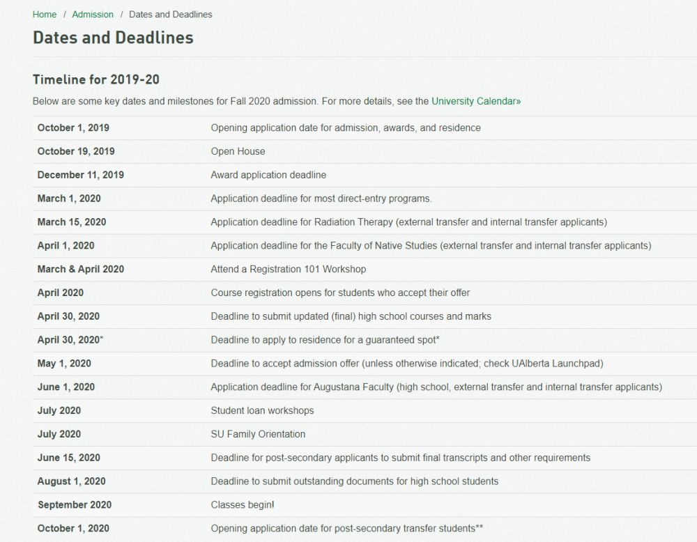 阿尔伯塔大学2020秋季入学申请截止日期为3月1日,材料截止日期中,教育学专业最早,为3月1日,工程类其次,为3月15日,其它专业为6月15日。