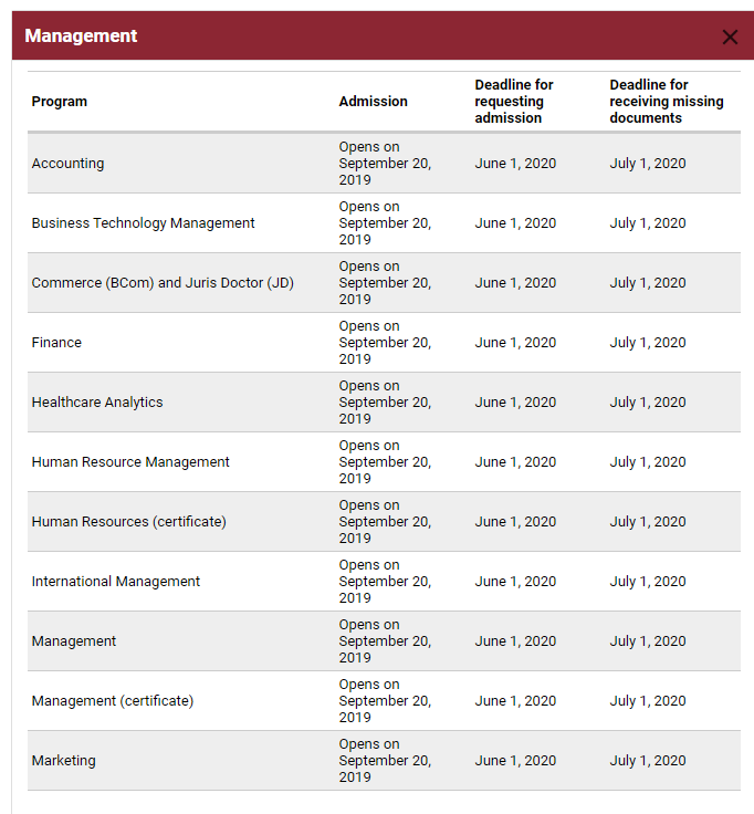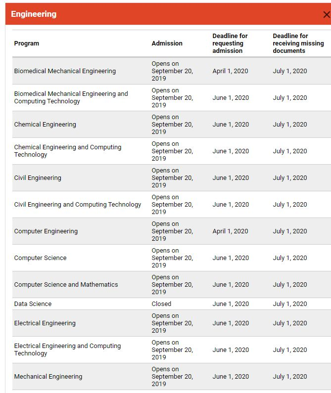 特定专业截止时间: 健康科学2月15日,理学——兽医技术护理文凭2月28日,音乐,建筑3月1日,理学(医学科学)3月15日,农学学士(国际食品商业):7月1日。
