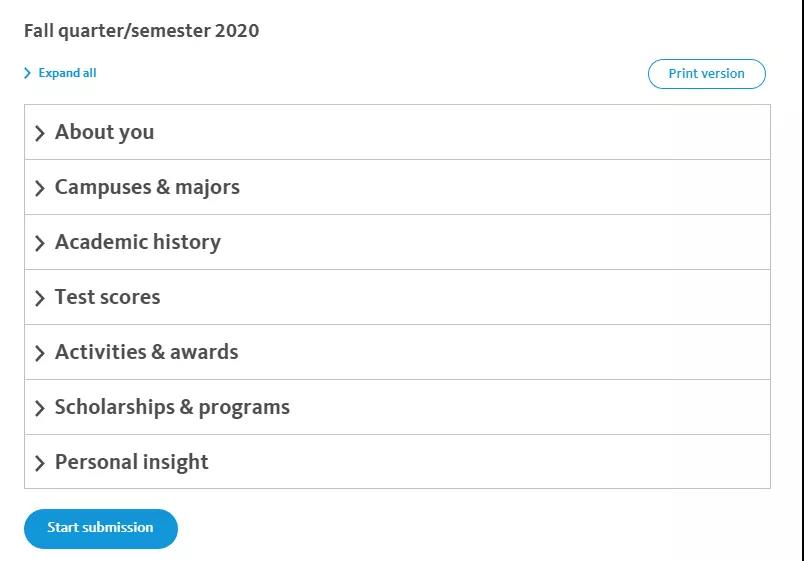 总的说来,整个UC网申系统的申请逻辑还算清晰的,而且申请者在填写过程中可以随时保存、退出、前进、后退,然后在主界面你能看到哪些环节已经完成,哪些还没有,最终这些环节全部完成后,同学们也就可以进入了最后一步提交了(Start Submission Process)。