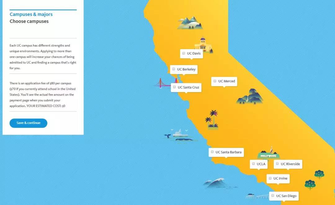 除了加州大学旧金山分校(研究生院)之外,加州大学9个校区都共用同一个申请系统。常常有很多学生一气儿勾选6,7所学校。这在一定程度上对于录取率的提高有一定作用,不过快报君还是建议根据自身的成绩和背景,将学校数量控制在5所左右为宜。