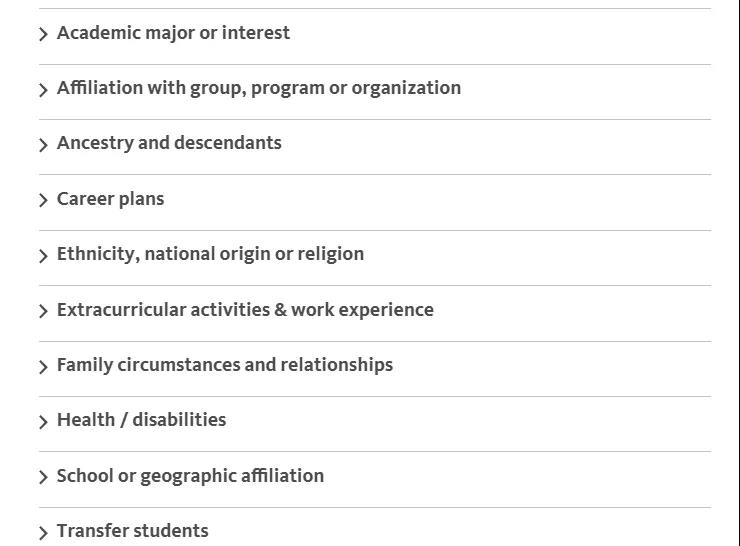 加州大学的奖学金可以说是非常有趣了,为申请者提供了非常多样的奖学金自申资格,比如你祖籍番禺,职业规划,对同性恋权利感兴趣亦或是有什么宗教信仰……虽然同学们可以随意勾选,不过,拿到奖学金的希望比较小。