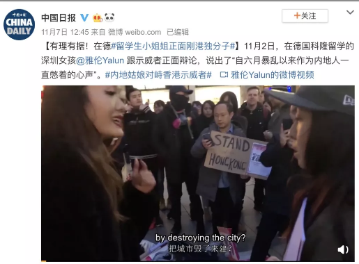 相信小伙伴还记得前几天微博上的一个热搜。 11月2日晚,在德国科隆街头,一位来自中国内地的女孩@雅伦Yalun,用中、英、德三种语言霸气对峙香港示威者,因发言犀利,逻辑清晰,回应有理有据,获得网友大量点赞。