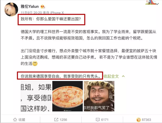 前两天, @雅伦Yalun 还专门就“你那么爱国干嘛还要出国?”这个问题,回怼了提问者的质疑——我是 为了学业 才来德国留学的,不然我怎么可能 放弃奶茶,移动支付和尝不完的外卖 。