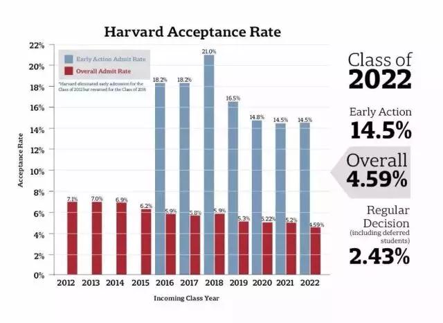 哈佛大学录取率首次跌破5%,达成史上录取率最低记录,以4.5%的录取率创下历史新低,且连续四年持续降低;十年来首次女性录取者超过男性录取者,比例达到50.1%。且一半的录取者有奖学金,其中70%的人是全奖。