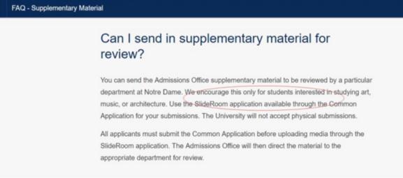 >>仔细看大学在常见问题( Q & A )部分对于补充材料的解释以及使用的语气,以下是圣母大学对于补充材料的说明中很明显地表明了鼓励对学习艺术、音乐和建筑专业的学生提交艺术作品集,其他专业都不建议提交。
