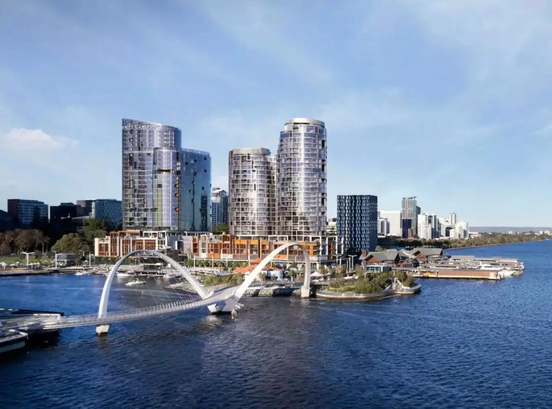 位于市中心的Elizabeth Quay, 眺望着天鹅湖, 远眺King's Park, 珀斯市区的地标建筑一览无遗。并由三座塔楼的酒店、住宅和零售商业构成。酒店大堂由10000块Kimberley砂岩拼接而成。 走在这里,将如同在Karijini峡谷步行,在室内即可体验峡谷特色。