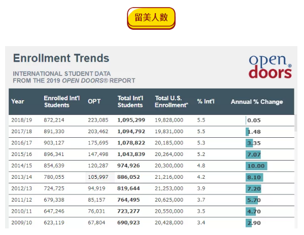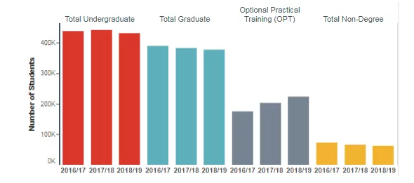 根据2019年国际教育交流门户开放报告, 国际学生总数为1,095,299,比去年增加0.05%。国际学生占美国高等教育总人口的5.5%。 根据美国商务部的数据,2018年,国际学生为美国经济贡献了447亿美元,比上年增长5.5% 。