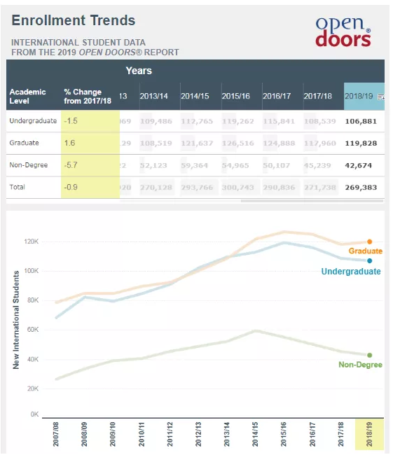 虽然在美留学的国际学生总数有所增加,但与2017/18年相比, 在2018-2019学年, 本科生数量依旧下滑,但相比于去年的-6.3%,今年 同比下降1.5%,稍好。 而研究生数量的增长趋势上升 、 有所“回暖”, 同比上升1.6%。