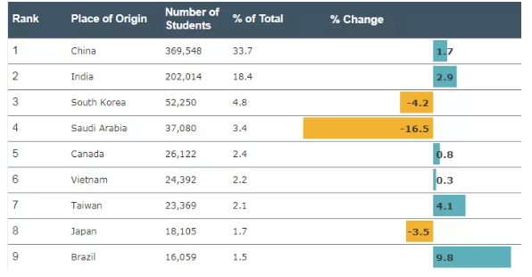 很多中国学生在美国都会认识印度同学和韩国同学, 作为三大生源国,中国学生总数大约是印度学生的2倍,而是韩国学生的7倍 。接下来在美留学生人数最多的依次是沙特阿拉伯、加拿大、越南、中国台湾、日本和巴西。
