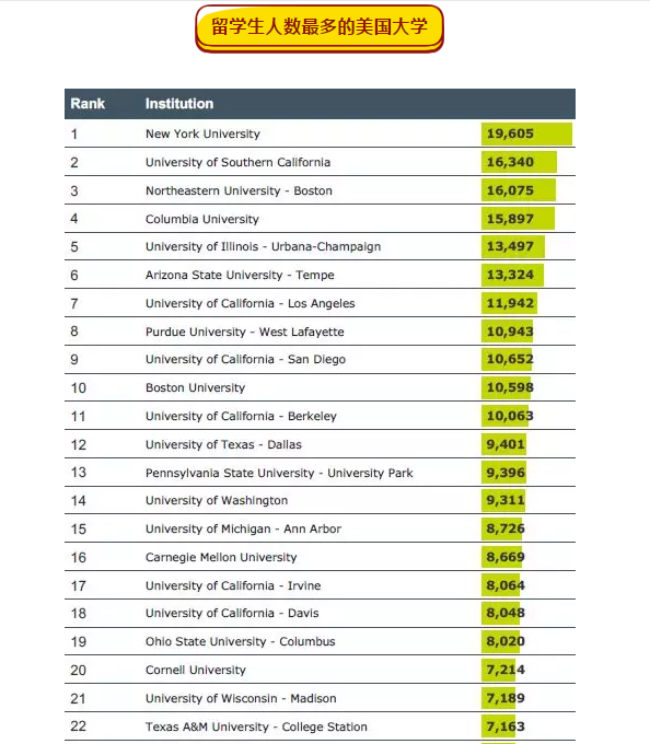纽约大学连续六年国际学生人数排名第一, 南加州大学仍然是第二大领军人物。 前十名还有: 东北大学、哥伦比亚大学、 伊利诺伊大学香槟分校、 亚利桑那州立大学 、 加州大学洛杉 矶分校、普渡大学西拉法叶分校,加州大学圣地亚哥分校和波士顿大学。