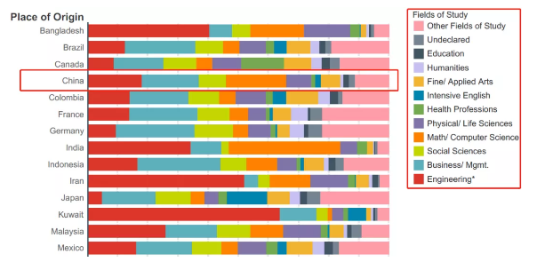 来自中国大陆的学生,我们可以看到学习最多的依旧是工程和商科 ,其次是数学和计算机科学,物理和生命科学,有一部分的学生学习艺术专业和社会科学。