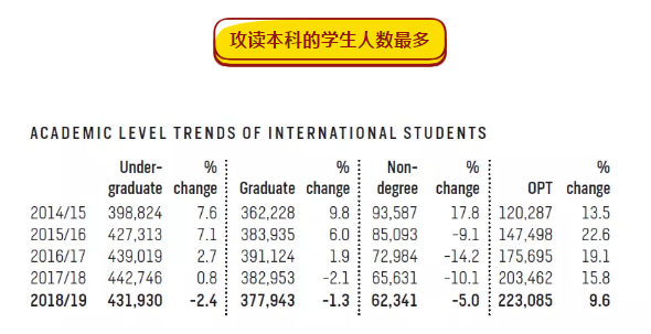 2019年“开放门户”报告显示,赴美留学的近110万国际生当中,读本科的人数最多,约为43.2万人, 下降了 2.4 % ,而攻读研究生学位的人只有约37.8万人,下降了1.3%。 非学位项目的学生人数下降了5.0%,为62341人。
