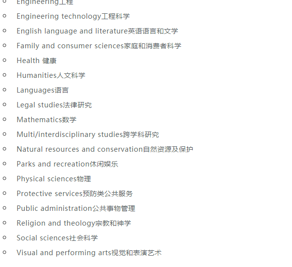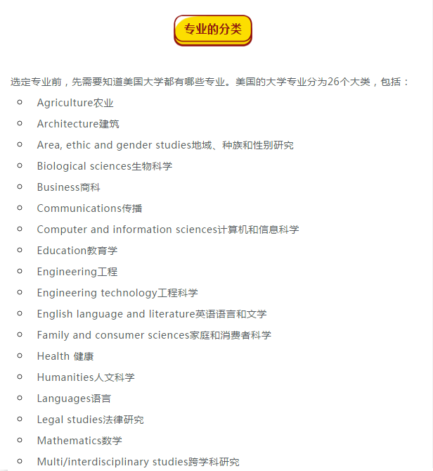 这些专业下面还有细分专业,比如商科的细分专业可能包括:Accounting 会计、Business Aministration & Management工商管理、Business Information Systems 商务信息系统、Entrepreneurship创业学、Finance 金融学、International Business 国际商务等等。