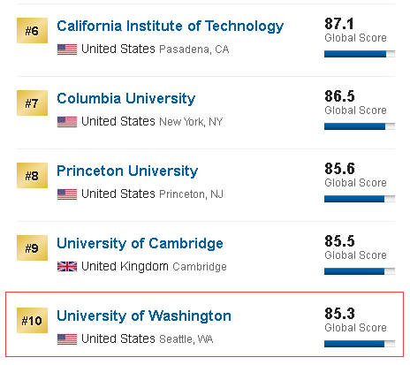华大西雅图2019USNEWS美国综合性大学排名59,2020USNEWS排名62,排名未升反而略有下降。然而,在USNEWS的世界大学排名中(Best Global Universities Rankings)中,华大西雅图却跻身Top10,与英国剑桥世界排名分数仅有0.2的差距。