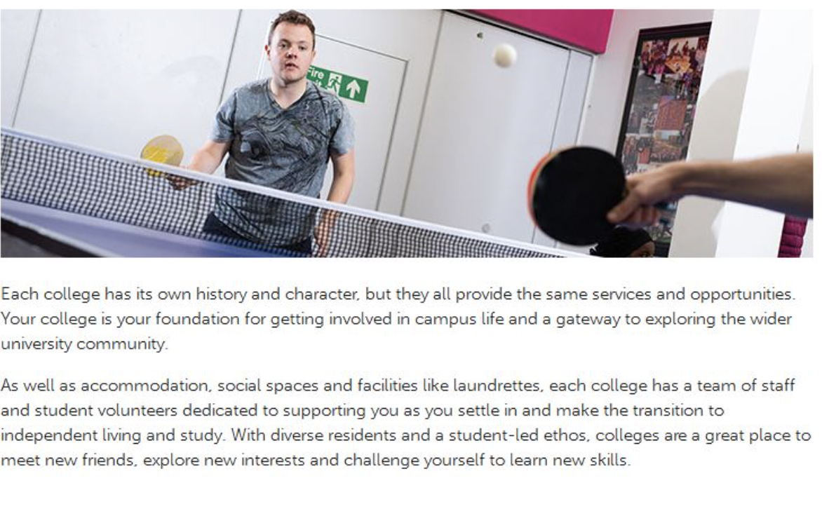 据校友介绍,约克大学的学院更像 住宅的大厅 一样, 并不像牛津和剑桥已经发展成为了“小大学”,让学生具有特别强烈的归属感。校方希望学生能从学院锻炼自己的社交能力,更好地融入到更大的环境中~