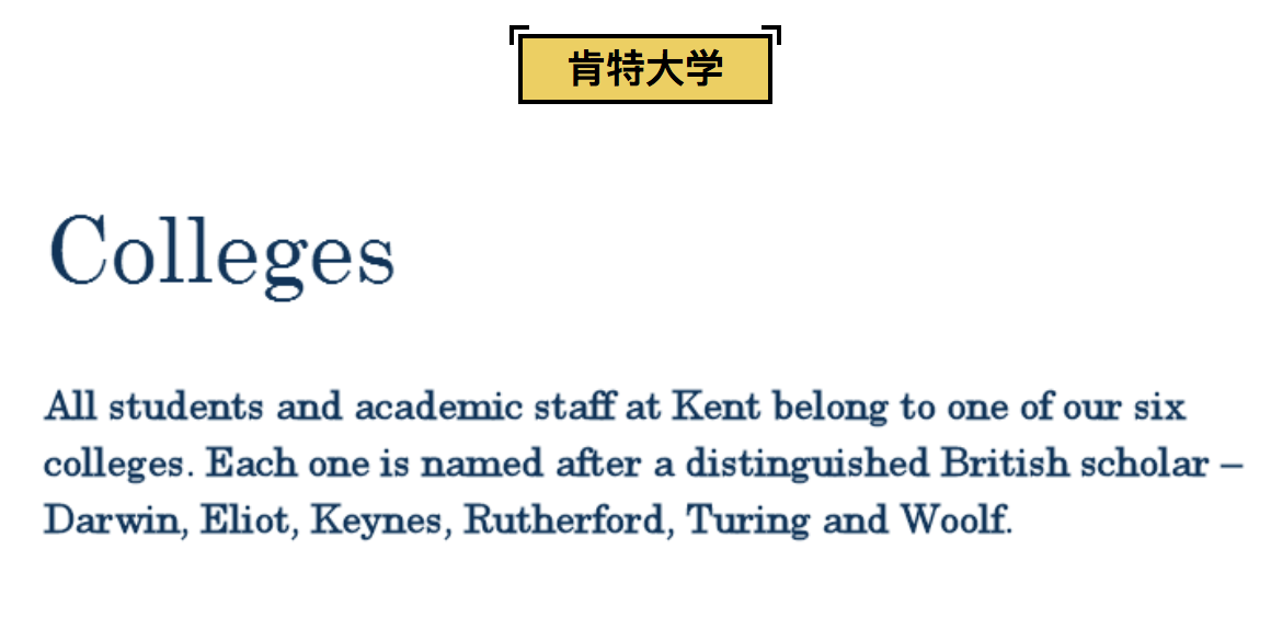 肯特大学各学院的命名方式很有趣,都是以英国 著名学者 的名字来命名的,比如艾略特、达尔文等。