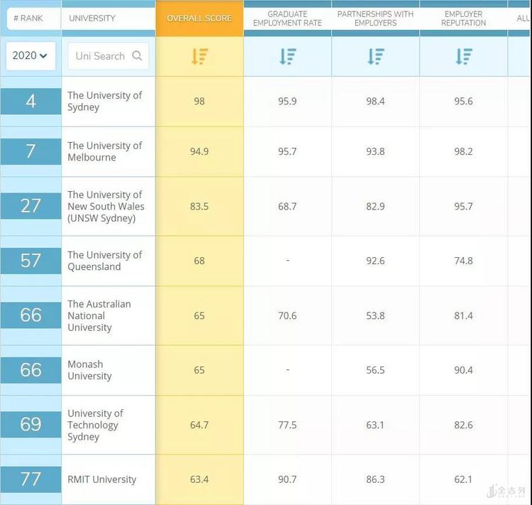 悉尼有悉尼大学,墨尔本也不甘落后,推出了王牌——墨尔本大学。作为澳洲八大之一,维州的龙头高校,墨大拿到了第7名的高位,毕业生一样能打,还胜过了剑桥大学(8)、牛津大学(10)、北京大学(19)等全球顶尖学府。 新南威尔士大学全球排名27,全澳第三,而且在校友成果这项上拿到了澳洲的最高分。 昆士兰大学排名澳洲第4位,全球排名第57位。 同为澳洲八大之一的澳洲国立大学和蒙纳士大学并列全球第66位。 接下来两所高校都是在QS综合排名中不显山不露水的,但其就业力排名超出众人想象。 黑马悉尼科技大学不仅学术排名每年在上升,就业排行榜的名次也颇高,位列全球第69。 皇家墨尔本理工大学(RMIT)本次排名第77名,是澳洲排名提升幅度最大的学校,比去年足足提高了8位!为进步 王 皇鼓掌!