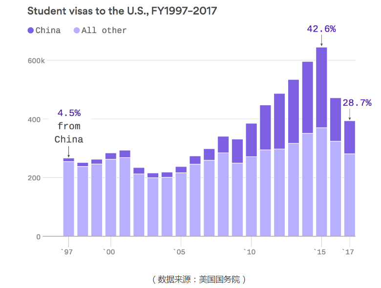 当然中国学生的签证减少,也有部分原因是 2014 年签证政策有效期变成 5 年,不再是一年一续签,所以签证数量也会减少。但是除了中国之外, F-1 签证 总体上 还是下降了 13 % 。据 NAFSA 国际教育者协会数据显示,外国学生在 2016-2017 学年为美国经济贡献了 369 亿 美元。