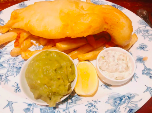 在英国人的心里,如果一定要选一个最能代表他们英国的食物,那必然是——炸鱼薯条! 普及程度几乎等同于我国的沙县小吃,几乎随便一个英国人开的小吃店,不论是在城市里还是镇上,你都能看见“Fish & Chips”的身影,英国人对其的喜爱程度可见一斑,但是它的口味……我只能说鱼肉是真的嫩,一般最常见的鱼肉种类是Co,然而也有类似Rock Co、Sea Bass、Haock、Lemon Sole等等的种类,我最常吃的还是Co,一般外部都会被炸出一层酥脆的皮,一口咬下去,外酥里嫩,还是很美味的。 然而英国人总喜欢搭配Mushy Peas,没错就是下图这个绿色的酱。 原谅我虽然知道这个酱很健康,然而还是接受无能,我宁愿来瓶番茄酱配薯条。