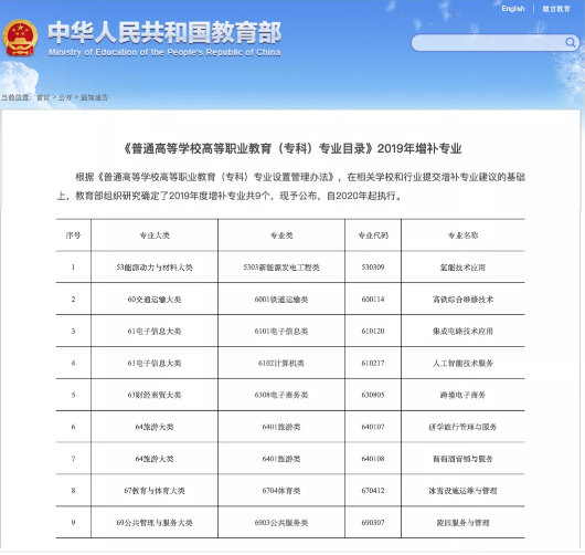 教育部官网公布,根据《普通高等学校高等职业教育(专科)专业设置管理办法》,在相关学校和行业提交增补专业建议的基础上,教育部组织研究确定了2019年度增补专业共9个,现予公布,自2020年起执行。