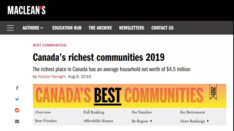近日,麦考林杂志发表了加拿大最富有的社区排名,这不是随口说说哦,这一排名基于对加拿大415个社区的家庭净值分析,调查数据包括: 财富和经济,负担能力,人口增长,税收,通勤,犯罪,天气,获得医疗保健,设施和文化。同学们来看看你的学校或者住所是不是在这些地区吧。