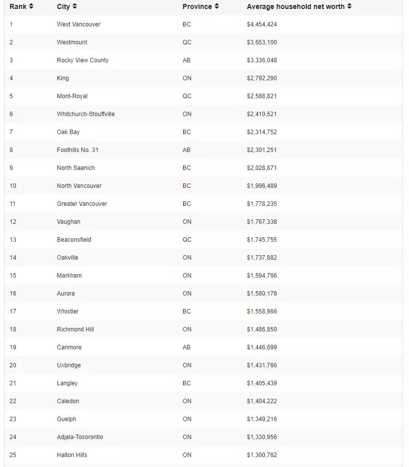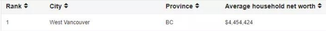 根据榜单我们可知:排名第一的是位于温哥华的大西温地区。该社区平均家庭净资产为450万元,属于全加拿大最高的。根据 Environics Analytics 的最新数据,该市(municipality)家庭收入中位数约为107,000元。