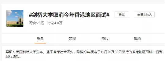#剑桥大学取消今年香港地区面试# 昨天一跃登上微博热搜,引起极大关注。