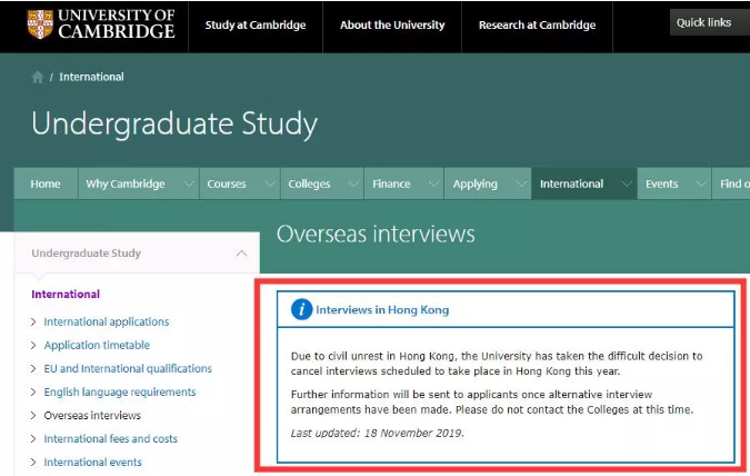 在剑桥大学官方网站上核实后发现,剑桥大学确实在其本科生招生页面的 " 海外面试 " 板块中给出了一个通告,内容是: