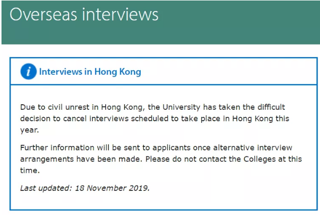 " 鉴于香港社会动荡,大学已经做出一个艰难的决定,取消今年在香港的面试安排。"