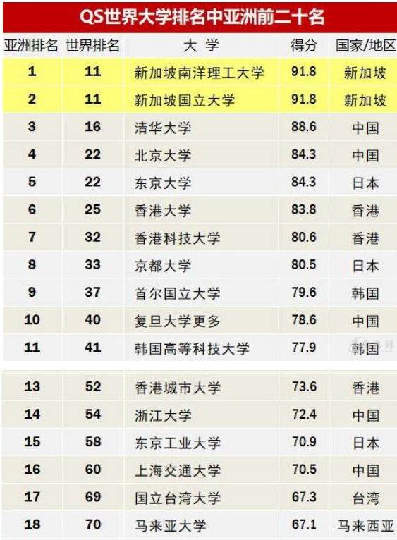 在今年全球知名大学排名机构QS发布了亚洲大学排名中,国内公认最好的两所大学清华和北大分列第3和第4位。