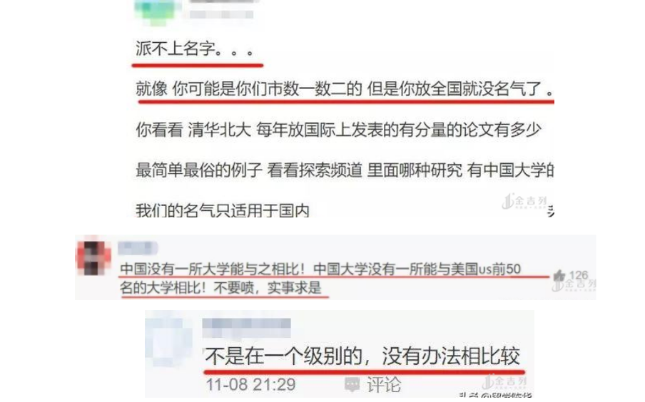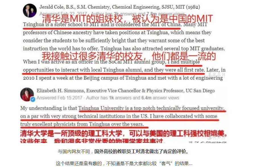 从上面截图可以看出,中国的大部份网友好像对清北并不感冒,他们认为清华和北大只是在国内比较出名,与美国的大学相比还有不小的差距。