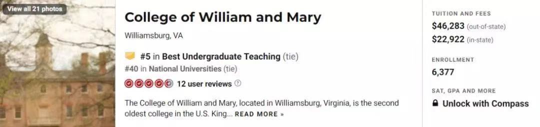 威廉玛丽学院,创立于1693年,是全美历史第二悠久的高等院校,建校时间仅次于1636年建立的哈佛大学。以精英教育著称,自美国建国以来一直享有非常高的名望。该校的硬件和软件环境都属一流,更是公立常春藤名校之一。