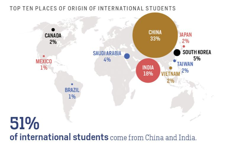 2019年,在美国的留学生人数达到了109万多,从生源地来看,中国已经超过9年连续成为最大生源国,现在共有36万多名中国大陆学生奔赴美国学习,占到了所有国际生的33%。