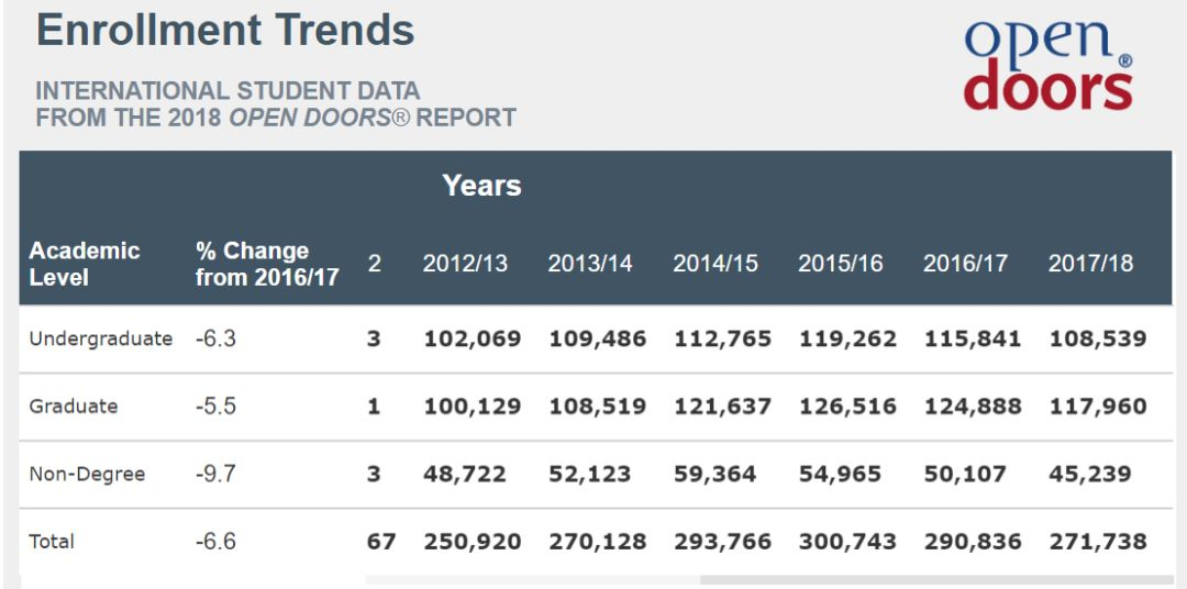 昨天,美国国际教育协会(IIE)发布了《New Open Doors Data》。《Open Doors》是一份非常权威的留学生现状报告,国际教育协会自1919年成立以来,每年11月都会基于美国国内近3000所大学的调查结果发布报告。