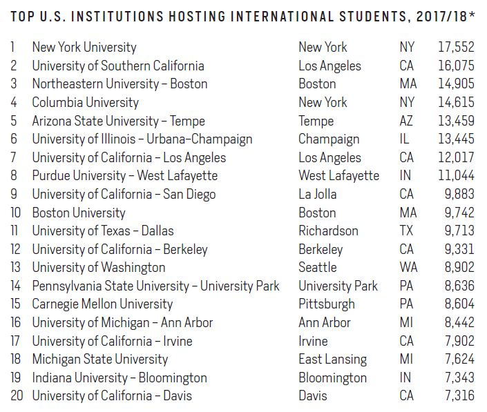从统计来看,留学生最多的大学是纽约大学,其次是南加大。常春藤中,哥伦比亚大学是最欢迎留学生的。此外,TOP30里UCLA、UCB、卡耐基梅隆大学、密歇根安娜堡都属于对国际生门户大开型(不过因为一些历史原因,密歇根安娜堡在中国的录取率并不高)。
