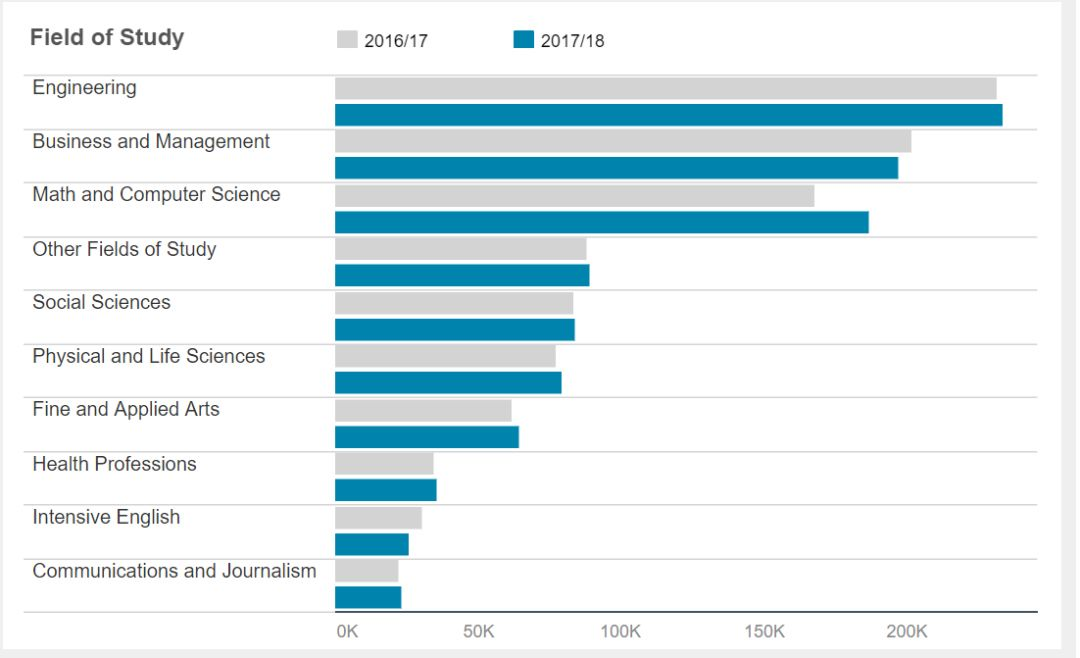先来看看所有留学生的整体情况,最热门的专业是工程,其次是商科和数学及CS。其中,商科虽然还是热门,但学习的人数是在下降的;工程略比去年有所增长,数学和CS的增速最快。看来,在留学生群体中,工程和CS取代商科成为最热门专业的势头非常强劲。