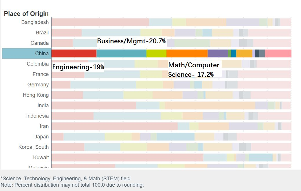 再来看看最受中国留学生欢迎的专业中,商科是最多的,目前有20.7%的中国留学生都在美国读商科,其次工程占19%,数学和CS占17.2%。除了这些大家公认的理想就业导向型专业,学习社科和艺术的人也不少。