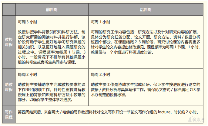 后四周,每周 1 小时 每周的研究工作内容包括:研究方法以及针对研究内容的扩展,具体分为研究任务分配、论文开题、研究方法、资料 / 数据分析这四个部分。在课题结尾 2-3 周阶段,研究讨论课的内容将更多针对学生论文内容提出修改意见。课程频率为每周 1 节课, 1 小时,教授仅与一个小组进行科研进度讨论。 第四周结束后,来自哥大 / 哈佛的写作教授将针对论文写作开设一节论文写作介绍的 lecture ,时长约 2 小时。