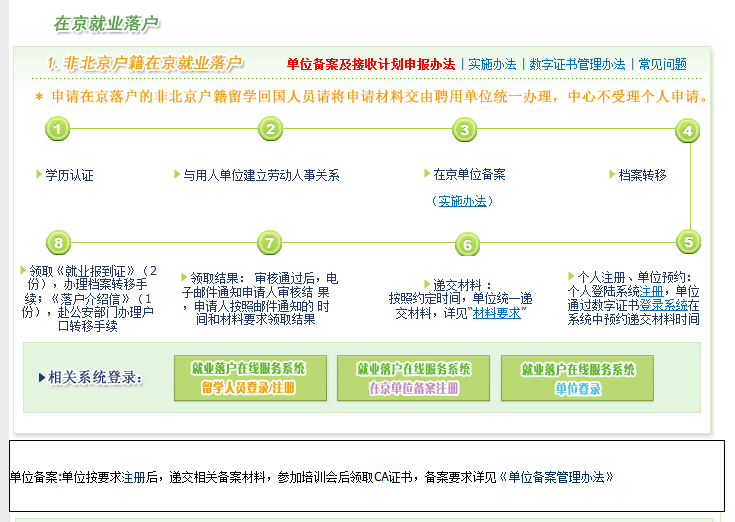 2 、申请在京落户的非北京户籍留学回国人员,请将申请材料交由聘用单位统一办理,中心不受理个人申请 ;
