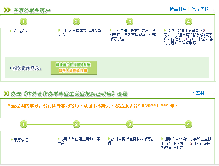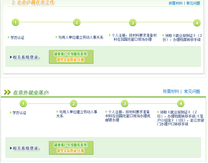 4 、北京户籍留学回国人员办理在京就业手续请本人到中心递送申请材料;