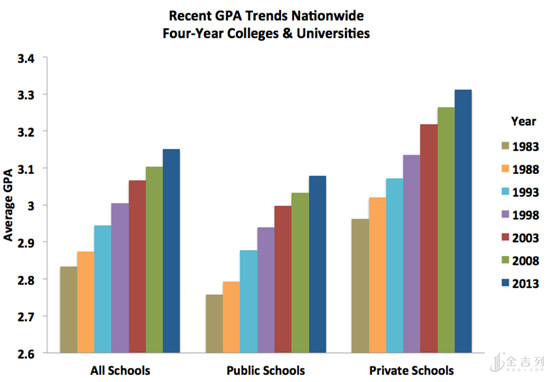 在过去的30年,每所美国大学的GPA都有一定的膨胀,过去得C的水平放到今天能拿到B,学生更容易获得相对高的GPA。相比较之下,私立大学的GPA膨胀更甚于公立大学,也就是公立大学会把分卡得更严。