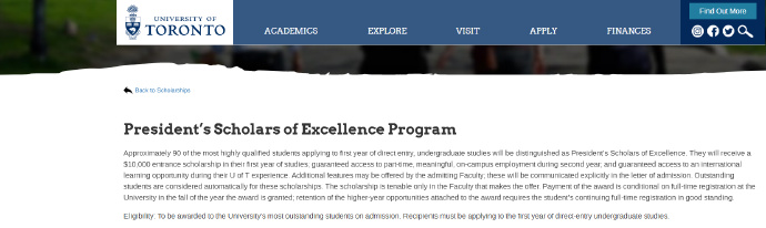 多伦多大学,针对国际生大一入学的奖学金中,含金量最高的是:Presient’s Scholars of Excellence Program,俗称“总统奖”。每年90个名额,奉上10000加币的支票,国际生可以申请,入学后自动发放,主要依据高中均分和其他学术表现。 北美这边,经常把一些奖项称做总统奖,但很多时候,和总统是没有关系的,比如,在加拿大,是没有总统的,只有总理。因此总统奖学金, 是一种约定俗成对荣誉的表达。