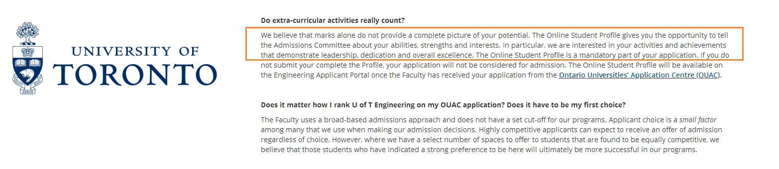 We believe that marks alone o not provie a complete picture of your potential. The Online Stuent Profile gives you the opportunity to tell the Amissions Committee about your abilities, strengths an interests. In particular, we are intereste in your activities an achievements that emonstrate leaership, eication an overall excellence.