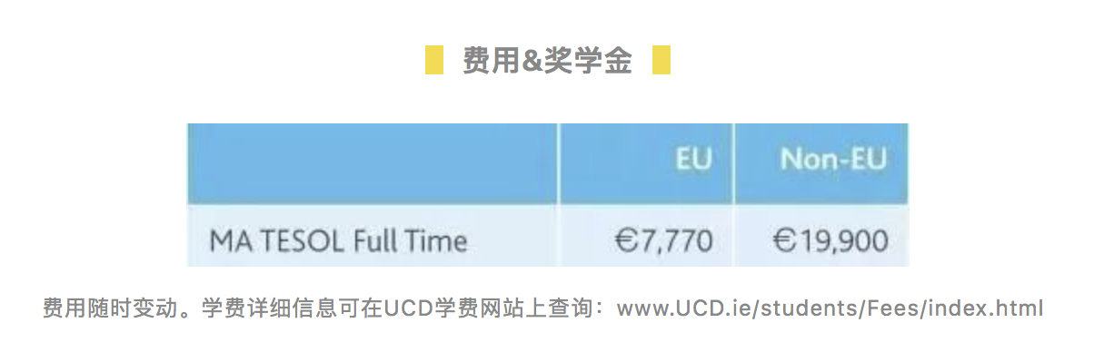 UCD应用语言中心提供了4个竞争奖学金名额(2名欧盟学生,2名非欧盟学生)给于2020-2021学年(9月开始)以全日制方式修读TESOL文学硕士课程的学生。